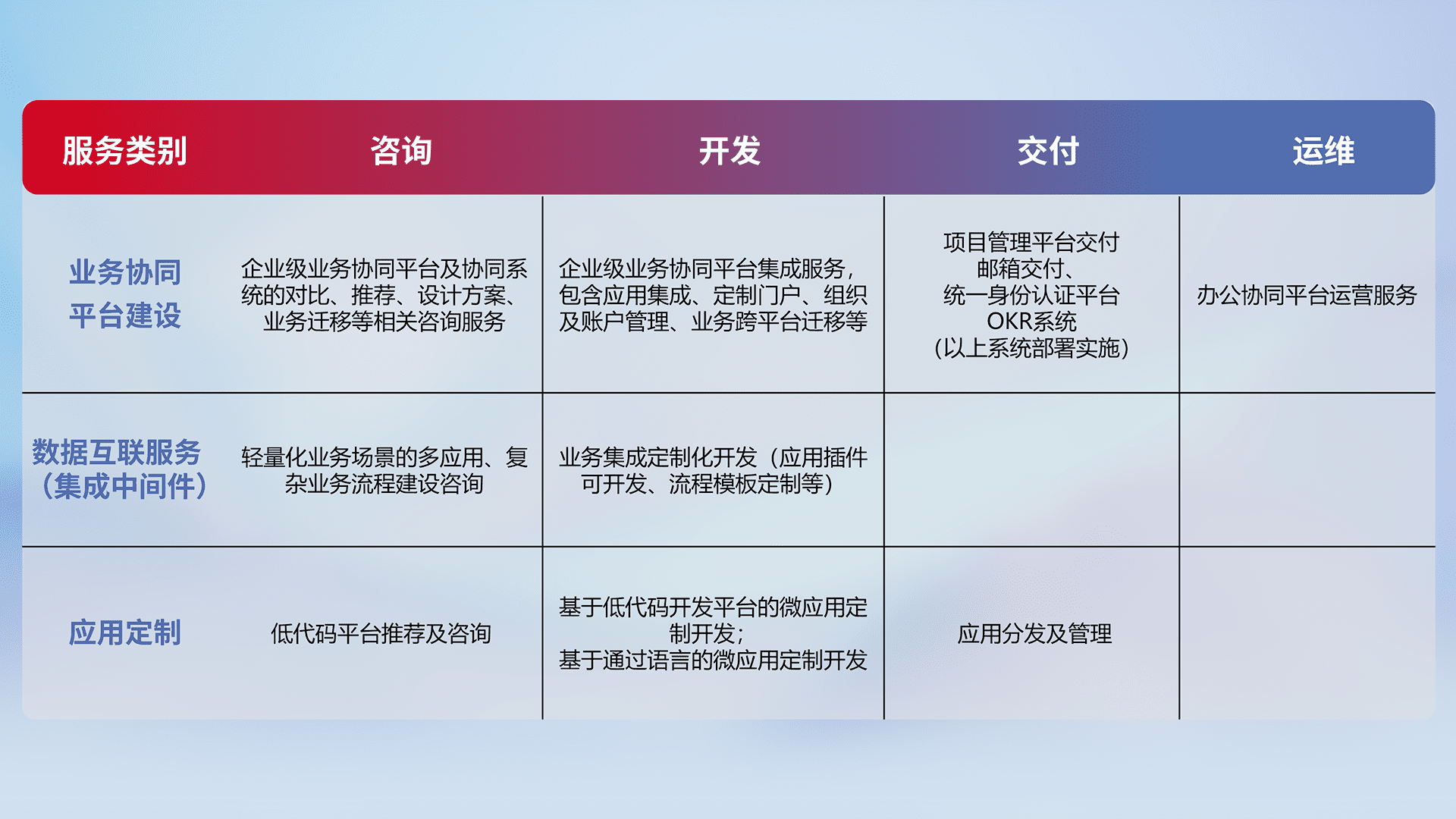 针对钉钉、、企微、、、、IDaas等平台级产品提供产品的规划、、、、方案、、、、交付、、、定制化开发等服务,,,实现如统一协同办公、、、、智能客户服务、、、、混合会议管理、、智能数据查询、、、等业务场景,,实现数字化转型。。。